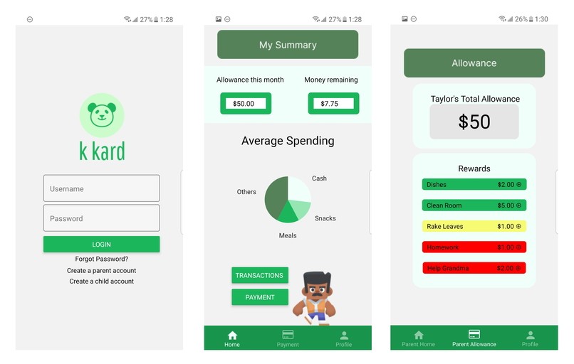 k kard is a mobile application, compatible with iOS and Android that provides a fun yet educational, safe and contactless payment solution such that parents can manage each transaction made by their child through a mobile platform. It is aimed towards millennial parents with children ages 8-12 who want to provide allowance without the hassle of dealing with cash or worrying about unreasonable transactions. k kard not only allows the child to make purchases through their own account, but tracks their spending and detects purchases out of the norm to alert parents when there is suspicious activity. We won FuturFund: Women in Financial Literacy and Perfect Pitch Award.