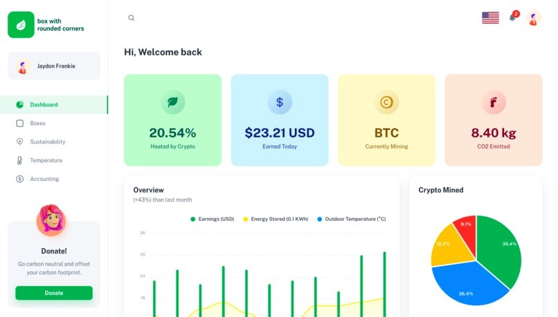 Box with Rounded Corners was a 24-hour hackathon project created for the 2022 Stanford Treehacks. The Box with Rounded Corners (The Box in short) is a platform where cryptocurrency miners could be used to provide free heating for small businesses. It consists of a custom-designed cryptocurrency mining rig, a smart thermostat system, and a data visualization platform powered by AI and ML to allow business owners to heat up their spaces more efficiently and effectively. We won several awards including the Moonshot Prize, Best Use of ML with Mage, Innovation, Best Application of Crypto.